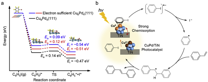 | Fig. 5. (a) Potential energy surface of iodobenzene dissociation over Cu6Pd4(111) and electron-rich Cu6Pd4(111) surfaces. (b) Proposed photocatalytic Heck reaction mechanism. | |