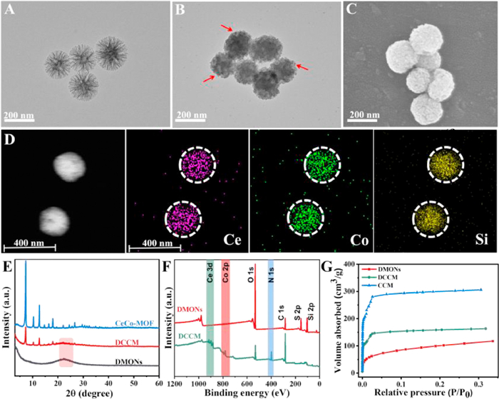 | Fig. 1. (A, B) TEM images of DMONs and DCCM, respectively. (C) SEM images of DCCM. (D) Scanning transmission electron microscopy and element mapping (STEM) of DCCM. (E) XRD patterns of CeCo-MOF, DMONs and DCCM. (F) XPS spectra of DMONs and DCCM. (G) N2 adsorption isotherm of various formulations. | |