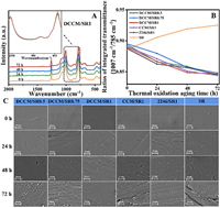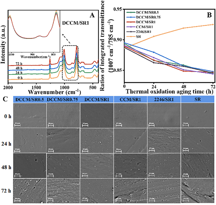 | Fig. 2. (A) ATR-FTIR spectra of DCCM/SR1 during aging at 250 ℃ for different hours. (B) Ratios of integrated intensity of the transmittance measured and calculated for all SR composites. (C) SEM photos of all samples surface at different thermal oxidation aging time. Scale bar: 10 µm. | |