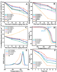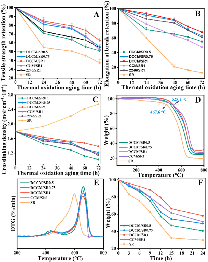 | Fig. 3. Retention of (A) tensile strength and (B) elongation at break of DCCM/SR composites at different thermal oxidation aging time. (C) Crosslink density trends of SR composites at different thermal oxidation aging time. (D) TGA curves of all SR composites before aging. (E) DTG curves of all SR composites before aging. (F) Isothermal weight loss curves of all SR composites within 24 h. Data are presented as mean ± SD (n = 3). | |