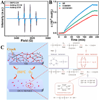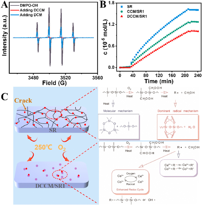 | Fig. 4. (A) Typical ESR DMPO—OH signals obtained after adding different materials. (B) Generation of CO2 of unaged SR composites for the in-situ test at 100 ℃. (C) Possible mechanism of DCCM on improving the thermal-oxidative aging properties of SR. | |