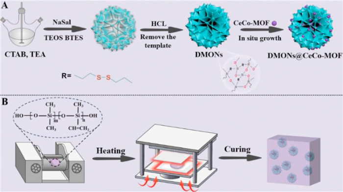 Although thermal stability of the SR composites has been improved owing to the advancing research on antioxidants, the mechanical strength after the heat treatment remains a challenge and impede the durability and lifetime of the silicone composites. For example, Zhao et al. [23] found the initial degradation temperature of SR was delayed by 40 ℃ with 37.5 parts of nano-Fe2O3, but its mechanical properties were significantly reduced. Li et al. [24] found that after adding 40% cerium oxide, the thermal oxygen stability of rubber was improved, but the tensile strength decreased. Herein, with a novel antioxidant-anchored silica surface enhancement strategy, which helps to synergistically enhancing the thermal and mechanical properties of the SR composite, instead of ignoring or even sacrificing the mechanical strength while improving the thermal stability as usual. We prepared DMONs@CeCo-MOF (DCCM) via a solution-assisted method by growing CeCo-MOF in-situ in DMONs, and SR composites were prepared with the general mixing and curing method shown in Scheme 1. Loading MOFs in dendritic mesoporous organosilica nanoparticles effectively addresses the issue of nonuniform dispersion between MOFs and the rubber matrix. The disulfide bonds in DMONs adsorb cerium and cobalt ions, which is essential to prepare CeCo-MOF and DMONs composites. As a result, the high oxygen catalytic efficiency and good dispersion bring about superb aging resistance at filler fractions as low as 0.5 phr. The successful synthesis of DCCM was demonstrated by transmission electron microscopy (TEM), X-ray photoelectron spectroscopy (XPS) and X-ray diffraction (XRD), and the effects of filler structure and antioxidants filler dispersion on thermal stability and mechanical properties of SR composites were studied systematically. We demonstrated that the strategy of organosilica@CeCo-MOF as antioxidant products showed significant potential in the "green rubber" sector.
