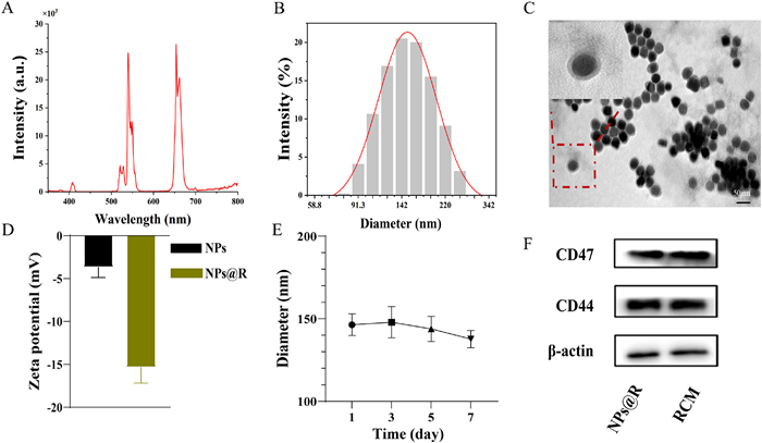 | Fig. 1. Characterization of nanoplatform. (A) The emission spectrum of UCNP under 980 nm excitation. (B) Particle size distribution of NPs@R. (C) TEM image of NPs@R (scale bar: 50 nm). (D) Zeta potential of nanoplatform. (E) Stability assessment of NPs@R over 7 days. (F) Western blot analysis for CD47 and CD44 in NPs@R and RCM, with β-actin as a control. Data are represented as mean ± SD (n = 3). | |