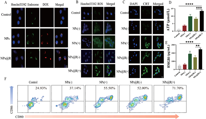 | Fig. 2. In vitro cellular experiments. (A) Endosomal escape experiments of control, NPs, and NPs@R. (B) ROS release after co-culturing different drug formulations with scc7 cells for 4 h. (C) Detection of CRT translocation on the cell membrane surface after co-culturing different drug formulations with scc7 cells. (D) ATP release after co-culturing different drug formulations with scc7 cells. (E) HMGB1 release after co-culturing different drug formulations with scc7 cells. (F) DC maturation after co-culturing drug treated scc7 with DC. Data are represented as mean ± SD (n = 3). **P < 0.01, ***P < 0.001, ****P < 0.0001. Scale bar: 30 µm. | |