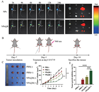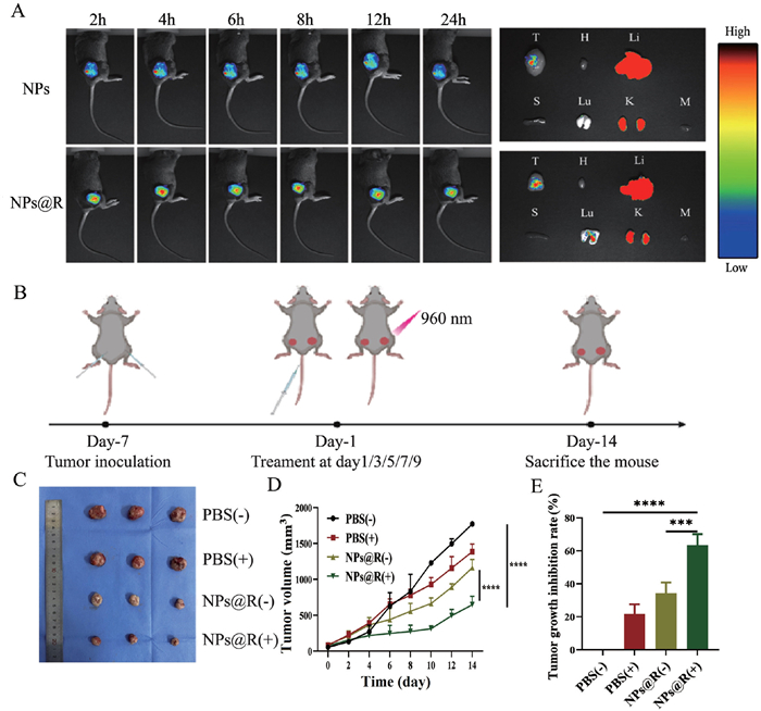 | Fig. 3. In vivo drug distribution and antitumor experiments. (A) Fluorescent images at the tumor site and organ distribution post-treatment (T: tumor, H: heart, Li: liver, S: spleen, Lu: lung, K: kidney, M: muscle). (B) Tumor treatment protocol. (C) Distant tumor imaging. (D) Volume changes in distant tumor. (E) Distant tumor inhibition rates. Data are represented as mean ± SD (n = 3). ***P < 0.001, ****P < 0.0001. | |