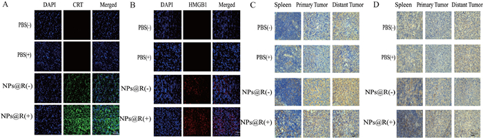 At the end of treatment, hematoxylin-eosin (H & E) staining of harvested tissues (Fig. S11 in Supporting information) showed no adverse changes, confirming the biosafety of the nanomedicine. Immunofluorescence staining (Figs. 4A and B) revealed increased levels of calreticulin (CRT) and high mobility group box 1 (HMGB1) in tumor tissues, predominantly in the NPs@R(+) group, consistent with in vitro results and validating ICD initiation by treatment. Immunohistochemical assessments (Figs. 4C and D) revealed increased infiltration of CD4+ T and CD8+ T cells in the NPs@R group, especially after laser treatment, indicating improved antigen presentation and T cell recruitment, effectively turning "cold" tumors into "hot" ones and enhancing the efficacy of immunotherapy.
