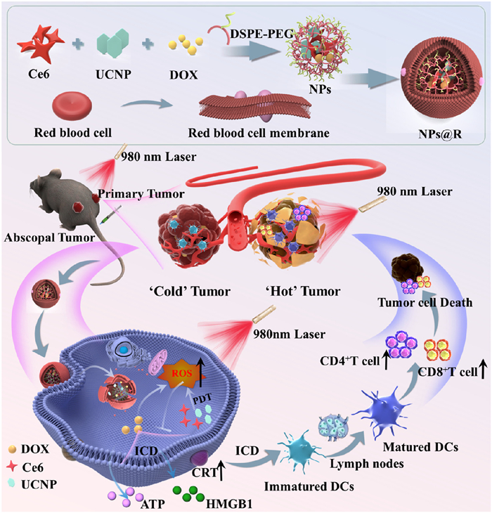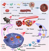 | Scheme 1. This diagram illustrates the innovative design of NPs@R, which combines PDT-UCNP and chemotherapy to treat OSCC through a cascading treatment approach. Nanoplatform is integrated with RBC membranes to facilitate the co-delivery of Ce6@UCNP and DOX. This strategic combination significantly enhances ICD and transforms immunologically dormant "cold" tumors into immunologically active "hot" tumors, revitalizing the TIME. | |