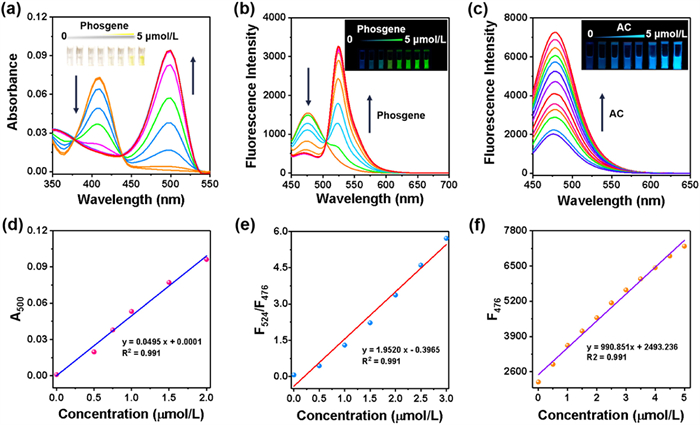 We first investigated the ultraviolet–visible (UV–vis) absorption and fluorescence spectral response of BDP-CHD to phosgene and some other acyl chlorides in chloroform. The sensing behavior of BDP-CHD to phosgene were assessed by using a non-volatile and low-toxicity counterpart, triphosgene, which can in situ generate phosgene in the presence of triethylamine. As shown in Fig. 1a, BDP-CHD displayed a powerful absorption band at 410 nm. After the addition of triphosgene (0–5.0 µmol/L) and triethylamine (TEA), the initial absorption peak (A410) of BDP-CHD gradually decreased. Simultaneously, a new absorption peak (A500) increased, and an obvious chromogenic reaction from colourless to yellow was observed (Fig. 1a). The isosbestic point was at 435 nm, indicating that BDP-CHD formed a single compound with phosgene. In addition, there was a good linear relationship between the absorbance of BDP-CHD and the concentrations of phosgene within the range of 0–2.0 µmol/L (R2 = 0.991) (Fig. 1d). It is noteworthy that the initial absorption band (410 nm) was completely converted to another absorption band (500 nm) after addition of 1.0 equiv. phosgene, implying BDP-CHD has high reactivity and sensitivity for phosgene. Subsequently, we explored the fluorescence sensing properties of BDP-CHD towards phosgene. BDP-CHD exhibited a faint fluorescence band at 476 nm in chloroform (Φf = 0.12), which is due to the PET effect from the DCH to the fluorophore (Fig. 1b). After the addition of triphosgene/TEA to the BDP-CHD solution, a new fluorescence band at 524 nm (Φf = 0.46) emerged. Meanwhile, a clear fluorescence change from weak blue to bright green was observed, which might ascribed to the formation of octahydrobenzimidazolone and BODIPY (Fig. 1b). Furthermore, there was a good linear correlation between the fluorescence intensity of BDP-CHD and the concentrations of phosgene within the range of 0–3.0 µmol/L (R2 = 0.991) (Fig. 1e), and an extremely low detection limit (LOD = 51.4 ppt) was obtained, which is sensitive enough to determine trace phosgene from the leakage of industry or accident CWAs terrorist attacks. These findings suggest that BDP-CHD could be employed as a ratiometric fluorescent and colormetric dual-mode probe for ultra-sensitive monitoring of phosgene.