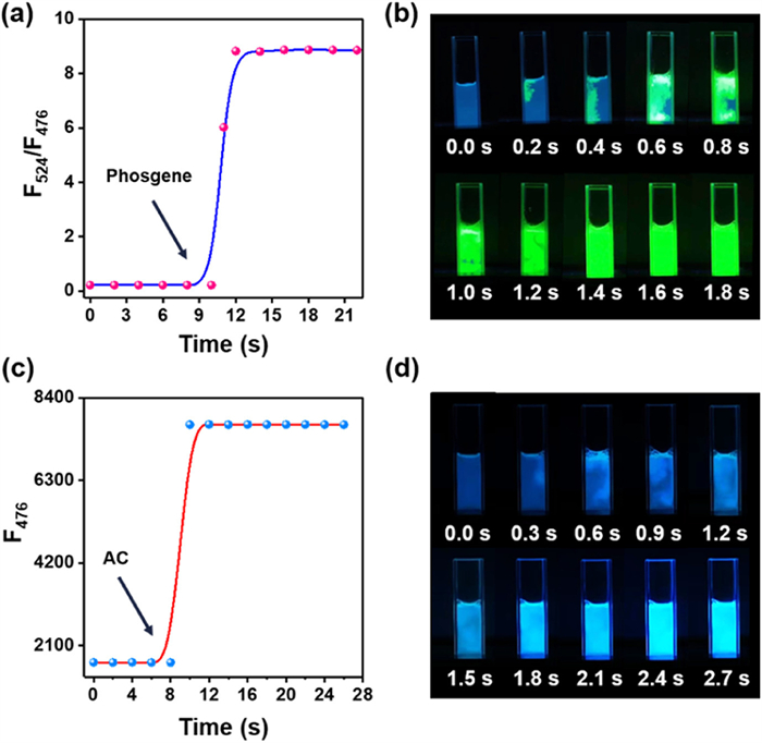 For the detection of highly hazardous substances, the response speed of the fluorescent probe should be very fast to reduce the harm to human body. Herein, we explored the response rate of BDP-CHD towards phosgene and AC. As shown in Fig. 2a, the ratiometric fluorescence intensity (F524/F476) of BDP-CHD reached a plateau within 2 s after the addition of phosgene. Furthermore, we recorded the time-lapse fluorescence images by a live video, as shown in Fig. 2b. The BDP-CHD solution showed a faint blue fluorescence under the UV lamp. After the addition of phosgene, a distinct green fluorescence appeared immediately in a local area of the solution, indicating that BDP-CHD was able to react rapidly with phosgene. With the diffusion of the phosgene, the entire BDP-CHD solution showed an increasing green fluorescence and reached the plateau within 1.6 s. For AC, the fluorescence intensity of BDP-CHD at 476 nm reached a maximum within 3 s (Fig. 2c), and the BDP-CHD solution showed a distinct blue fluorescence within 2.4 s (Fig. 2d). From these observations, we can conclude that BDP-CHD can be used to rapidly detect phosgene and some other violate acyl chlorides.