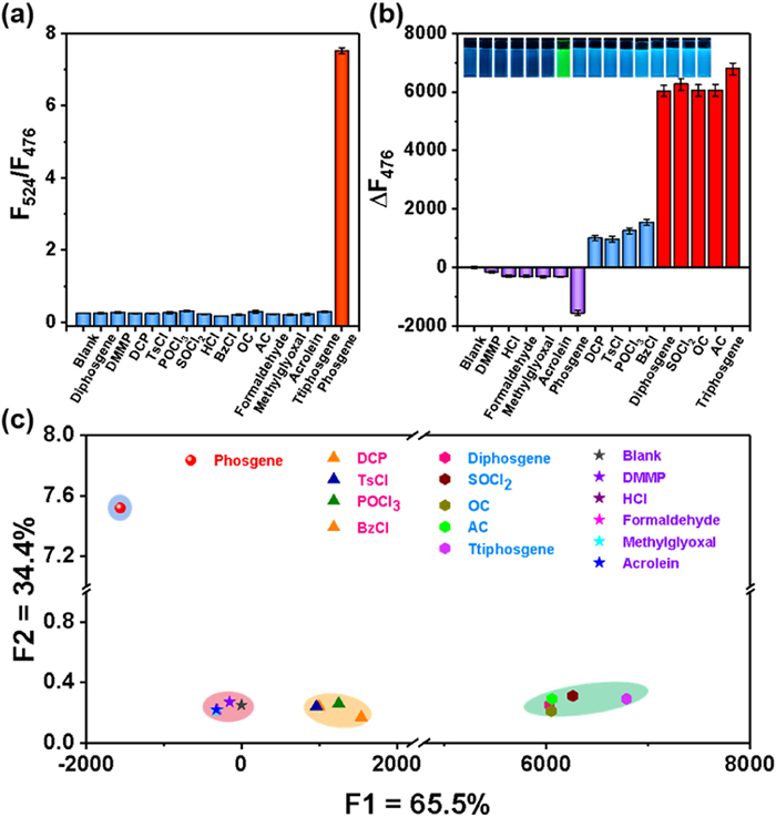 We then examined the fluorescence response of BDP-CHD to phosgene, various acyl chlorides and some potential interfering species, including diphosgene, dimethyl methylphosphonate (DMMP), DCP, TsCl, POCl3, SOCl2, HCl, BzCl, OC, formaldehyde (FA), methylglyoxal (MGO), acrolein, and triphosgene. As shown in Figs. 3a and b, BDP-CHD generated a remarkable ratiometric (F524/F476) fluorescence response to phosgene. Diphosgene, DCP and some other acyl chlorides stimulated BDP-CHD to produce large fluorescence enhancement at 476 nm, respectively. By contrast, BDP-CHD exhibited negligible fluorescence response to the potential interfering species such as hydrochloric acid, DMMP, formaldehyde, methylglyoxal and acrolein, suggesting that BDP-CHD has good selectivity for phosgene and acyl chlorides. Given that the different responses of BDP-CHD to the above analytes, we conducted a LDA statistical analysis which can identify the optimal linear combinations of features for different classes of analytes. The LDA statistical analysis results were projected on a two-dimensional (2D) space, as shown in Fig. 3c. BDP-CHD showed a remarkable green fluorescence after exposed to phosgene. Hence, phosgene itself was divided into a group. Aldehydes, acids, DMMP and BDP-CHD cannot lead to significant fluorescence changes, and thus they were divided into another group. Amazingly, acyl chlorides can be categorized into two groups in the LDA diagram according to different fluorescence intensity. These observations demonstrated that BDP-CHD can serve as a "one-to-more" probe for high-throughput detection of phosgene, acyl chloride, aldehydes and hydrochloric acid.