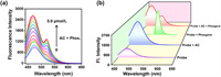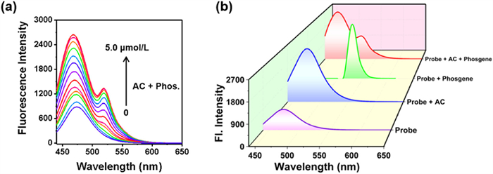 | Fig. 4. (a) Fluorescence spectra of BDP-CHD solution (5.0 µmol/L) and TEA (100.0 µmol/L) upon the addition of phosgene and AC (0–5.0 µmol/L). (b) Fluorescence spectra of BDP-CHD solution (5.0 µmol/L) upon the addition of AC, phosgene or both of AC and phosgene. λex = 430 nm, slits: 2.5 nm/5.0 nm. | |