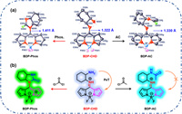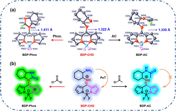 | Fig. 5. (a) The single-crystal structure of BDP-CHD, BDP-Phos and BDP-AC. (b) The reaction mechanism of BDP-CHD with phosgene and acetyl chloride, respectively. | |