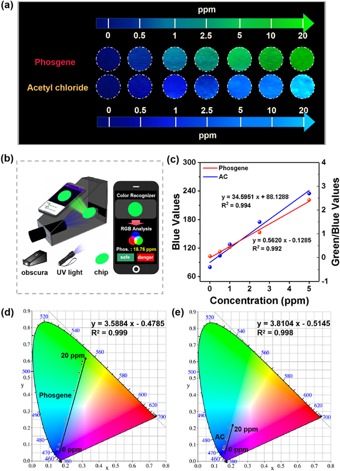 | Fig. 6. (a) Fluorescence response images of BDP-CHD test strips towards phosgene and acetyl chloride vapor (0–20 ppm). (b) Schematic illustration of fluorescent sensing platform integrated in a smartphone. (c) Linear correlation of the G/B values of strips with phosgene (0–5.0 ppm). Linear correlation of the B values of strips with acetyl chloride vapor (0–5.0 ppm). CIE1931 coordinates of BDP-CHD test strips towards incremental (d) phosgene or (e) acetyl chloride (0–20 ppm). | |