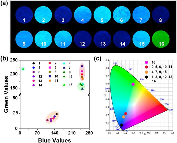 | Fig. 7. (a) Fluorescence photographs of BDP-CHD-loaded strips upon treatment with phosgene, acyl chlorides or various analytes (20 ppm): (1) blank, (2) diphosgene, (3) DMMP, (4) DCP, (5) TsCl, (6) POCl3, (7) SOCl2, (8) HCl, (9) BzCl, (10) OC, (11) AC, (12) FA, (13) MGO, (14) acrolein, (15) triphosgene, and (16) phosgene. (b) RGB values LDA diagram of BDP-CHD test strips for 16 analytes, respectively. (c) CIE1931 coordinates of BDP-CHD test strips in the presence of 16 analytes, respectively. | |