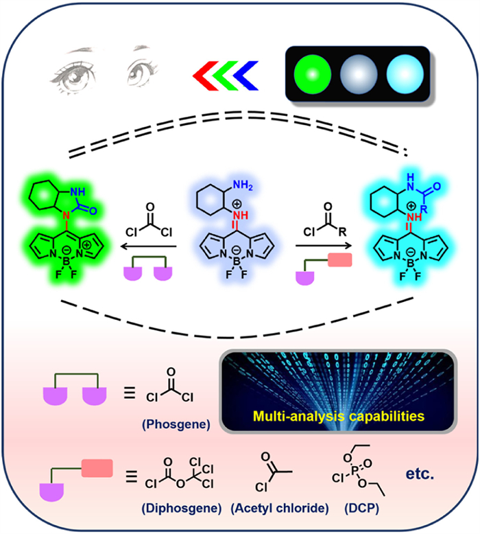 Phosgene, diethyl chlorophosphate (DCP) and acyl chlorides are essential chemical intermediates, and have been widely used for manufacturing medicines, pesticides, dyes and polymers [1]. It is estimated that tens of thousands of tons of acyl chlorides are consumed globally each year. Whereas, phosgene, DCP and acyl chlorides are highly toxic volatile organic compounds [2]. Exposure to 20 ppm of phosgene can cause severe injury to lung and respiratory in a few minutes, and exposure to 90 ppm phosgene for 0.5 h can be lethal [3,4]. DCP can bind with acetylcholinesterase to inhibit conduction of nerve impulses, leading to organ failure and death within seconds [5-11]. Acetyl chloride can activates the flow of tears as little as 0.5 ppm, and high concentration may cause death or permanent damage [12]. Moreover, most of acyl chlorides can result in dermal and respiratory diseases [13,14-19]. Volatile acyl chlorides pose a serious threat to our public security once industrial leakage accidents happened or they were used as chemical warfare agents (CWAs) by terrorists. To safeguard our public security and human health, it is very important for the development of a simple and efficient tool for on-site high-throughput screening of phosgene, DCP and a diversity of acyl chlorides.