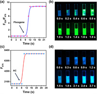 | Fig. 2. (a, c) Time-course fluorescence intensity and (b, d) images of BDP-CHD (5.0 µmol/L) in CHCl3 containing triphosgene (5.0 µmol/L), TEA (100 µmol/L) or AC (5.0 µmol/L). λex = 430 nm, slits: 2.5 nm/5.0 nm. | |
