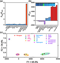 | Fig. 3. Fluorescence intensity changes at (a) F524/F476 and (b) F476 of BDP-CHD solution (5.0 µmol/L) upon exposure to various analytes (10.0 µmol/L). (1) Blank, (2) diphosgene, (3) DMMP, (4) DCP, (5) TsCl, (6) POCl3, (7) SOCl2, (8) HCl, (9) BzCl, (10) OC, (11) AC, (12) FA, (13) MGO, (14) acrolein, (15) triphosgene and (16) phosgene. (c) 2D LDA diagram of fluorescent arrays consisting of 16 types of analytes. λex = 430 nm, slits: 2.5 nm/5.0 nm. Data are presented as mean ± standard deviation (SD) (n = 3). | |