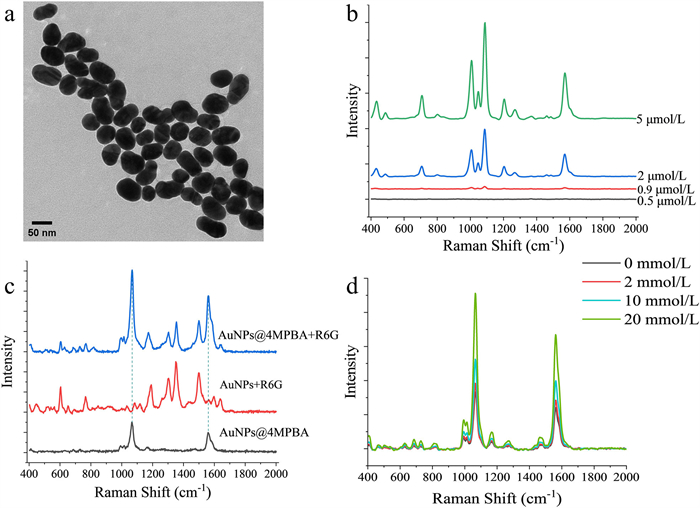 | Fig. 1. The characterization of AuNPs and AuNPs@4MPBA using TEM and SERS spectra. (a) TEM image of AuNPs showing ellipsoidal morphology. (b) Detect sensitivity of AuNPs to 4-MPy, laser power: 33 mW and the integration time: 5 s. (c) SERS test of AuNPs@4-MPBA on Rhodamine 6G (R6G), with characteristic peaks appearing at 1067 and 1560 cm−1, and also exhibiting a non-specific enhancement effect. (d) SERS spectral titrations of AuNPs@4-MPBA with glucose with feature peak changes at 1067 and 1560 cm−1. | |