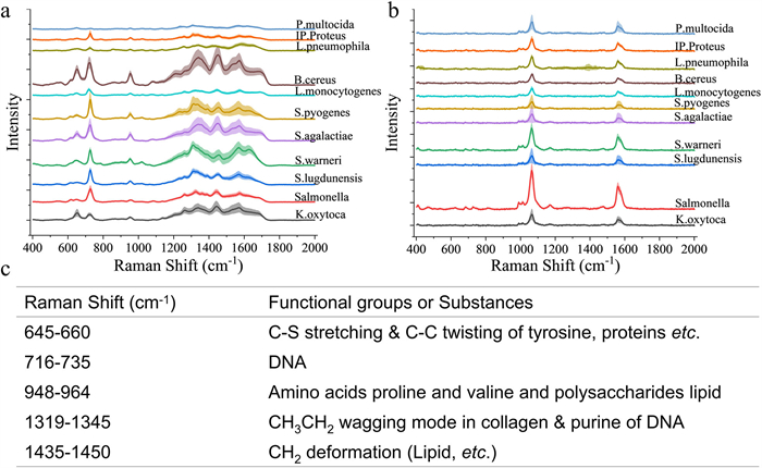 | Fig. 2. SERS spectra of different bacteria interaction with AuNPs and AuNPs@4MPBA, respectively; and peak identifications of the SERS spectra. (a) The non-specific SERS spectra of AuNPs interaction with 11 bacteria. (b) The specific SERS spectra of AuNPs@4MPBA interaction with 11 bacteria. (c) Non-specific SERS spectral identification of AuNPs interaction with 11 bacteria. Klebsiella oxytoca (K. oxytoca), Salmonella, Staphylococcus lugdunensis (S. lugdunensis), Staphylococcus warneri (S. warneri), Streptococcus agalactiae (S. agalactiae), Staphylococcus pyogenes (S. pyogenes), Listeria monocytogenes (L. monocytogenes), Bacillus cereus (B. cereus), Legionella pneumophila (L. pneumophila), Indole-Positive Proteus (IP. Proteus), Pasteurella multocida (P. multocida). | |