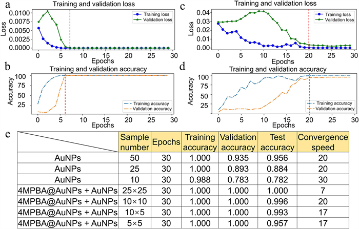 | Fig. 4. Training and validation plots of loss and accuracy with different spectral concatenation ratios. (a) Training loss curves of 30 epoch training using 25 non-specific spectra and 25 specific spectra concatenated alongside dim = 1 to produce a total of 6875 spectra (25 × 25 × 11). (b) Training accuracy curves of 30 epoch training using 25 non-specific spectra and 25 specific spectral concatenation. (c) Training loss curves of 30 epoch training using 550 non-specific spectra. (d) Training accuracy curves of 30 epoch training using 550 non-specific spectra. (e) The performance metrics for different concatenations. | |