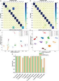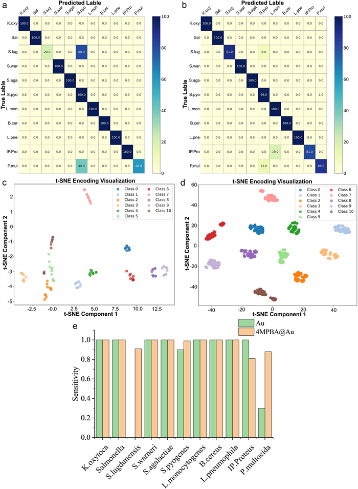 | Fig. 5. Confusion matrix for the non-specific SERS spectra alone and non-specific/specific SERS spectral concatenation and dataset processing. (a) Testing of extra unknown samples using the trained model with non-specific spectra. (b) Testing of extra un-known samples using a trained model with the spectral concatenation of non-specific and specific spectra. (c) t-SNE plot for test classification using models trained with non-specific spectra. (d) t-SNE plot for test classification using models trained with the spectral concatenation of non-specific and specific spectra. (e) The sensitivity obtained by the methods. | |