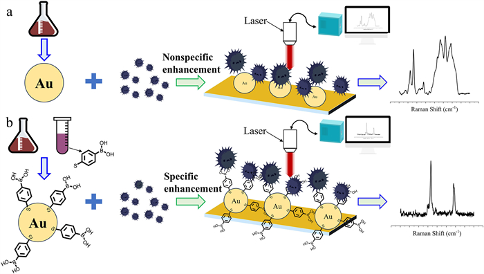 | Scheme 1. Schematic diagram of non-specific/specific SERS spectral acquisition. (a) Procedure for AuNPs preparation and non-specific SERS spectra acquired by interaction of AuNPs and bacterial samples. (b) The functionalization of AuNPs by 4-mercaptophenylboronic acid and specific SERS spectra acquired by covalent interaction of phenylboronic acid with the diol groups in the surface of bacteria. | |
