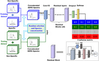 In conclusion, a new strategy of non-specific and specific SERS spectral concatenation was developed to pretreat the training data fit for deep learning neural network. Upon background subtraction and baseline correction using airPLS algorithm, the SERS spectra were selected to splice along with assigned dimension to increase information abundance, which showed faster convergence and better performance metrics than pure non-specific SERS data when input into the residual neural network. Compared with non-specific SERS spectra (50 spectra), the same amount of 25 non-specific-25 specific SERS spectra (50 spectra) can provide larger amount of concatenated spectra (625 spectra) with large increase of feature information content; And the same size of concatenated spectra (50 spectra) can be obtained by the combination of 10 non-specific and 5 specific SERS spectra (15 spectra), which achieve to offer large amount of training data with fewer sample or markedly save workload and time for sample collection. With this strategy, we achieved to perform the bacteria classification with high accuracies (100% in model training, 96.3% in extra test of large sample size and 93.6% in extra test of small sample) and faster convergence in training process, proved the feasibility of the strategy with smaller sample size. Not only that, the model trained using this method can also be well applied to the new dataset, and the new model can be retrained with only a slight modification of the dataset. Moreover, it can be generally incorporate with diverse machine learning algorithms with marked increase of performance metrics, which improve the performance of traditional deep learning models incapable of precise and rapid analysis without enough samples.