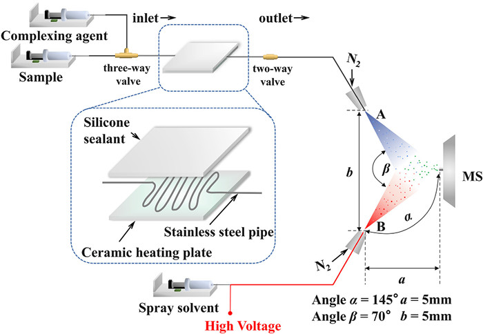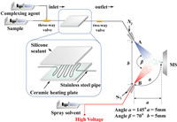 As shown in Fig. 1, the heating reaction device consists of a silicone sealant layer, stainless steel tubes and a ceramic heating plate, which is located between the three-way valve and two-way valve. The inlet is on the three-way valve side. The sample and OPD solution are mixed at the three-way valve and enter the inlet. The outlet is on the two-way valve side, where the complex containing liquid enters the capillary tube through the two-way valve. The temperature control accuracy of the heating reaction device is ±0.1 ℃. The heated part of the stainless steel tube has a length of 208.0 mm and an inner diameter of 0.5 mm. For on-line analysis, the sample and OPD solution were both delivered to the heating reaction device through a micro syringe pump at the speed of 5.0 and 10.0 µL/min, respectively. The heating reaction time is about 164 s. The complex containing liquid forms spray A under the action of nitrogen. Methanol forms spray B under the action of nitrogen and a high voltage of 4.0 kV. The spray A and spray B collide at an angle of β to achieve the extraction of spray A. Then the fragment ions are prepared for MS analysis.