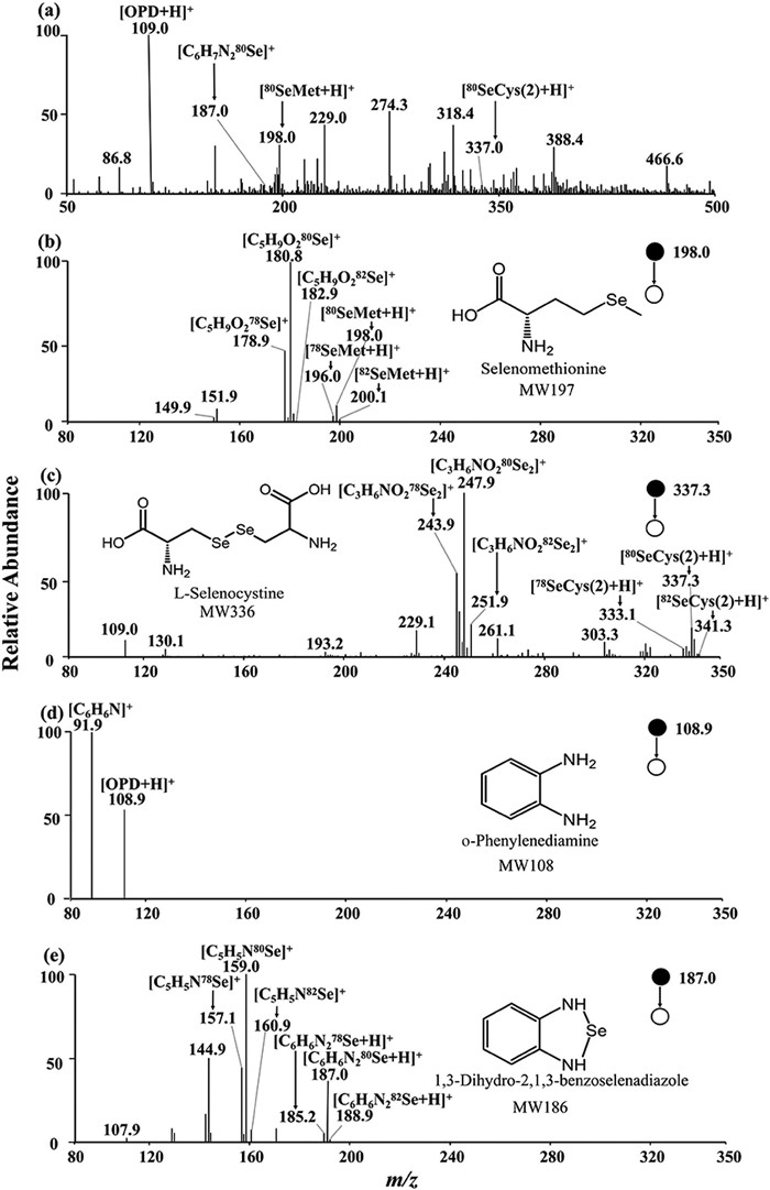 | Fig. 2. Mass spectra of selenium compounds. (a) Mass spectra of standard mixed solution; (b) MS2 spectra of selenomethionine; (c) MS2 spectra of l-selenocystine; (d) MS2 of o-phenylenediamine; (e) MS2 of 1,3-dihydro-2,1,3-benzoselenadiazole. | |