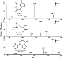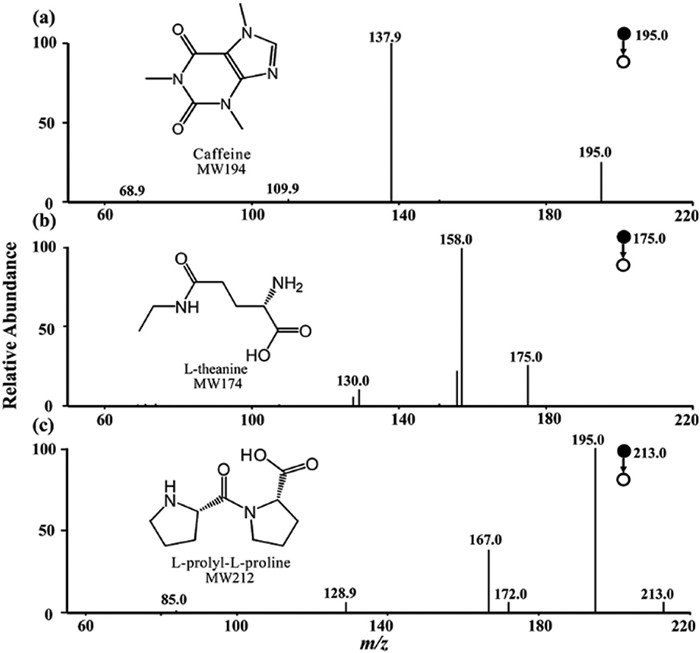 Fig. 4 displays the results of the tandem mass spectrometry analysis of the three ions previously mentioned. As shown in the inset figure of Fig. 4a, m/z 137.9 is the main product peak of [C6H8N3O]+ originating from the loss of CH3–N═CO from [Caffeine+H]+ [49]. In Fig. 4b, m/z 158.0 is the main product peak of [C7H14N2O2]+ originating from the loss of –OH from [l-theanine+H]+ [50]. As shown in the inset of Fig. 4c, m/z 195.0 and m/z 167.0 are the main product peaks of [C10H15N2O2]+ and [C9H15N2O]+, respectively, originating from the losses of H2O and HCOOH from [l-prolyl-l-proline+H]+ [51].