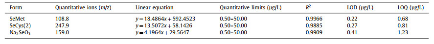 Prepare mixed standard solutions of three target compounds according to the method described in Supporting information 1.2. The linearity, limits of detection (LOD), and limits of quantification (LOQ) of the three compounds (SeMet, SeCys(2), and sodium selenite) were determined in this study to validate the method.