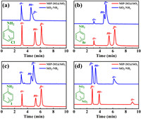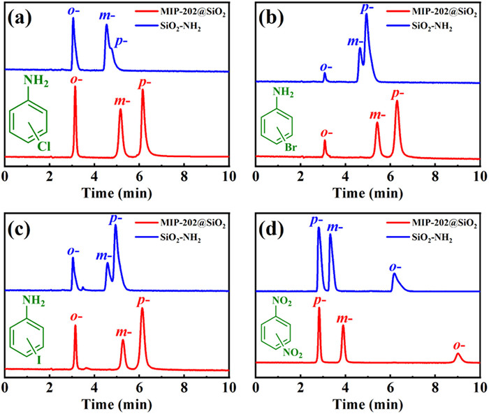 | Fig. 2. Chromatograms of positional isomers of chloroanilines (a), bromoanilines (b), iodoanilines (c) and dinitrobenzenes (d) on the MIP-202@SiO2 column and the SiO2-NH2 column. Chromatographic conditions: mobile phase: n-hexane/isopropanol = 85/15 (v/v); column temperature: 25 ℃; flow rate: 1.0 mL/min; detection wavelength: 254 nm. | |