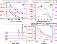 | Fig. 3. Influence of flow rate (a), injection volume (b) and IPA content (d) on the retention time, column efficiency, resolution and selectivity. (c) Chromatograms of 1-phenylethanol enantiomers on the MIP-202@SiO2 column with different injection volumes. Chromatographic conditions: (a) mobile phase: n-hexane/isopropanol = 90/10 (v/v), injection volume: 2 µL; (b, c) mobile phase: n-hexane/isopropanol = 90/10 (v/v), flow rate: 1.0 mL/min; (d) flow rate: 1.0 mL/min, injection volume: 2 µL. Column temperature: 25 ℃; detection wavelength: 254 nm. | |