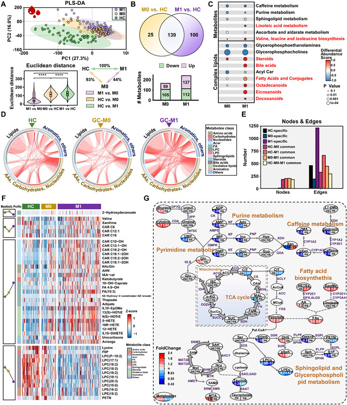 | Fig. 1. Evolutionary metabolic alterations in circulating plasma of progressive GC. (A) PLS-DA analysis of the plasma metabolic expression profiles as well as their expression distances between the metabolic profiles of different groups, which were measured using Euclidean distances. The inset summarizes the average distance between pairs of samples as a percentage of the distance between M1 and HC plasma samples. ****P < 0.001. (B) Venn plot and bar plot of the differential metabolites in M0 (HC vs. M0) and M1 (HC vs. M1). (C) Metabolic pathways (P < 0.05) enriched by significantly differential metabolites in M0 (HC vs. M0) and M1 (HC vs. M1). (D) Circos plots of the differential metabolites (P < 0.00001). (E) Node and edge numbers in HC, M0, and M1 specific metabolic networks. (F) Heatmap of differential metabolites in plasma. (G) The integrated metabolic networks of GC. The full name of all the metabolites' abbreviations are summarized in the list of abbreviations in Supporting information. | |