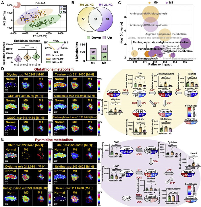 | Fig. 2. Specific spatial metabolic alterations in progressive GC. (A) PLS-DA analysis of the metabolic expression profiles as well as their expression distances measured using Euclidean distances. The inset summarizes the average distance between pairs of samples as a percentage of the distance between M1 and NC tissue samples. ****P < 0.001. (B) Venn plot and bar plot of the differential metabolites with P < 0.05, and FC > 1.2 or FC < 0.833. (C) Significantly dysregulated metabolic pathways. MSI images and pathway networks of (D) glutathione metabolism and (E) pyrimidine metabolism. | |