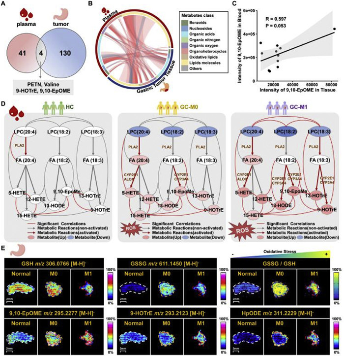 An integrated analysis of plasma and spatially-resolved metabolomics were conducted from progressive GC patients to enhance the identification of metabolic crosstalk between tumor and plasma and investigate the underlying metabolic mechanisms. We identified four metabolites (phosphoethanolamine (PETN), valine, 9,10-epoxy-12-octadecenoic acid (9,10-EpOMe), and 9-hydroxyoctadeca-10,12,15-trienoic acid (9-HOTrE)) changed with the same trend in both tumor and plasma (Fig. 3A). Their structures were shown in Fig. S8 (Supporting information), encompassing two oxidative lipid species. We further investigated the metabolic correlations among the discriminated metabolites in tumor tissues and plasma (Fig. 3B). Notably, 9,10-EpOMe (a class of the oxidative lipids derived from linoleic acids) exhibited a significantly positive correlation between tumor tissues and plasma (P = 0.053, R = 0.593) (Fig. 3C). These findings highlight the active involvement of oxidative lipids in metabolic communication between GC tumors and the bloodstream, which might be crucial in the metabolic reprogramming of tumorigenesis and metastasis.