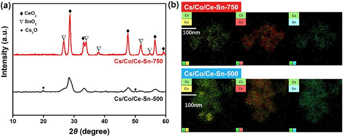 X-ray diffraction (XRD) measurements were utilized to analyze the crystal structures of the Cs/Co/Ce-Sn-500 and Cs/Co/Ce-Sn-750 catalysts. As shown in Fig. 1a, the typical peaks of CeO2 were mainly observed in all the catalysts (PDF #43–1002). For the Cs/Co/Ce-Sn-500 catalyst, besides the major diffraction peaks of CeO2, two minor diffraction peaks of Cs oxide (PDF #09–0111) at around 20° and 50° were also detected. After high-temperature calcination (750 ℃), some diffraction peaks for SnO2 were formed (PDF #41–1445). However, no peaks associated with Cs or Co oxides were observed, which could be due to the high dispersion of Cs and Co oxides. The elemental mapping of the Cs/Co/Ce-Sn-500 and Cs/Co/Ce-Sn-750 catalysts was carried out (Fig. 1b) to confirm the high dispersion of Cs and Co oxides. Clearly, the Cs and Co oxides for Cs/Co/Ce-Sn-750 catalyst were well dispersed, which agreed with the XRD results.