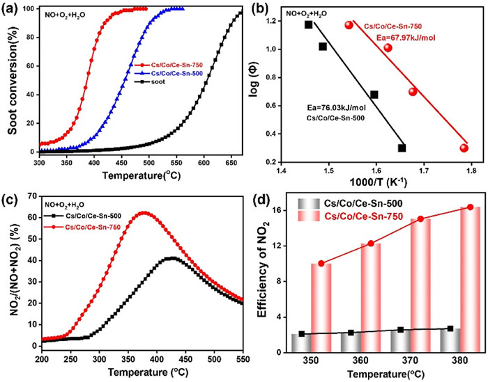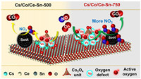 In conclusion, this work unexpectedly found that a Cs/Co/Ce-Sn catalyst calcined at a high temperature of 750 ℃ showed much higher soot oxidation activity than that calcined at 500 ℃. Characterization results revealed that high-temperature calcination can drive the alkali metal Cs to transfer more negative charge density to other metal cations, inducing the production of more oxygen defects on the surface of the Cs/Co/Ce-Sn sample. The increase in the number of oxygen defects had advantage in the formation of more active oxygen species, thus improving the NO2 utilization efficiency for soot catalytic oxidation. Therefore, Cs/Co/Ce-Sn-750 performed superior soot oxidation activity. This work provides an in-depth understanding of the influence of calcination temperature on this soot oxidation catalyst and may aid in the design and synthesis of high efficiency catalysts for the removal of soot.