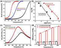 | Fig. 4. (a) Soot conversion, (b) Ozawa plots for soot conversion of the as-prepared samples with different heating rates (2, 5, 10, and 15 ℃/min), under loose contact mode and a GHSV of 300,000 mL g−1 h−1. (c) NO2/(NO+NO2) ratio in the outlet feed over the as-prepared catalysts in NO-TPO test without soot. (d) Utilization efficiency of NO2 at different temperatures over the catalysts. Feed composition: 1000 ppm NO, 5% H2O, 10% O2, and N2 balance. | |