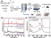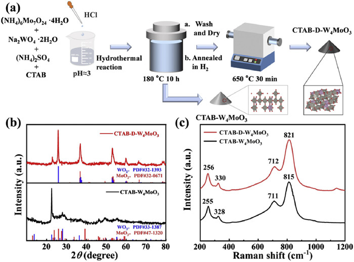 | Fig. 1. (a) The schematic synthesis diagram of W4MoO3 nanowires deficient in oxygen vacancies (CTAB-W4MoO3) and W4MoO3 nanowires rich in O-vacancies (CTAB-D-W4MoO3 NWs). (b) XRD patterns and (c) Raman spectra of CTAB-W4MoO3 and CTAB-D-W4MoO3. | |