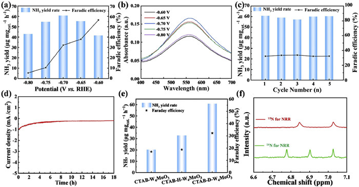 | Fig. 3. (a) NH3 yields and FEs of CTAB-D-W4MoO3 at a series of potentials. (b) UV–vis absorption spectra of 0.1 mol/L Na2SO4 after 2 h electrolysis on CTAB-D-W4MoO3. (c) NH3 yields and FEs of CTAB-D-W4MoO3 at −0.70 V during recycling tests. (d) Time-dependent current density curves of CTAB-D-W4MoO3 for NRR at −0.70 V. (e) NH3 yields and FEs of CTAB-D-W4MoO3 CTAB-H-W4MoO3 and CTAB-W4MoO3. (f) 1H NMR spectra of the electrolyte after NRR using 15N2 and 14N2 as the nitrogen source, respectively. | |