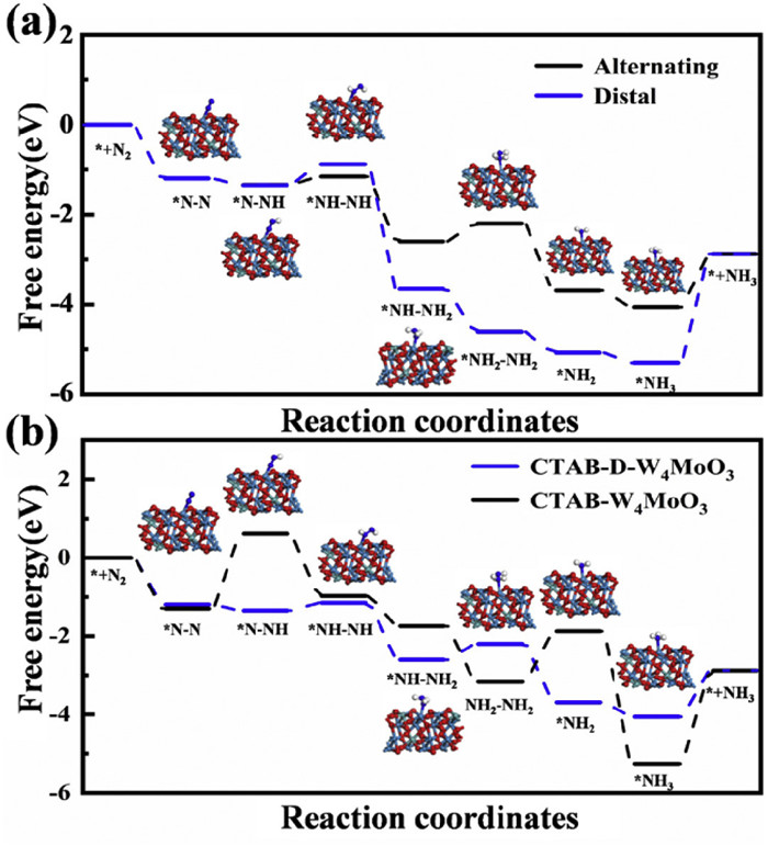 | Fig. 4. (a) Reaction free energy pathways of NRR on CTAB-D-W4MoO3. (b) Free energy diagram of the NRR along the alternative pathway on CTAB-D-W4MoO3 and CTAB-W4MoO3. | |