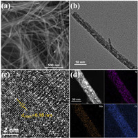| Fig. 2. (a) Scanning electron microscope (SEM), (b) TEM, (c) high resolution transmission electron microscope (HRTEM), and (d) corresponding EDS elemental mapping images of CTAB-D-W4MoO3. | |