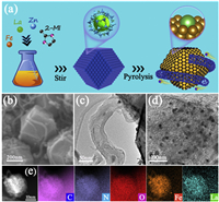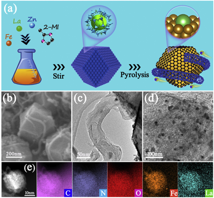 | Fig. 1. (a) The synthesis procedure of the La-Fe/NC. (b) SEM image of La-Fe/NC. (c) TEM image of CNT. (d) TEM image of La-Fe/NC. (e) HAADF-STEM image with its respective elemental mapping images. | |