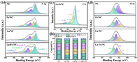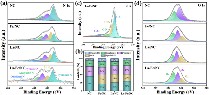 | Fig. 2. (a) XPS N 1s spectra of the different samples. (b) The composition of different nitrogen species in the samples. (c) XPS C 1s spectrum of La-Fe/NC. (d) O 1s spectra of NC, Fe/NC, La/NC, and La-Fe/NC. | |