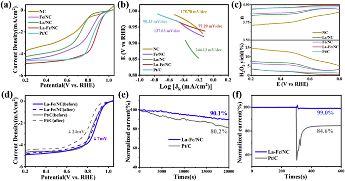 | Fig. 3. The catalysts’ ORR performance was evaluated in a 0.1 mol/L KOH electrolyte under O2-saturated conditions. (a) LSV curves, (b) Tafel slopes, (c) electron transfer numbers, and H2O2 yields of the NC, Fe/NC, La/NC, La-Fe/NC and 20 wt% Pt/C samples. (d) LSV curves of La-Fe/NC and 20 wt% Pt/C before and after 5000 cycles. (e, f) Curves of the catalyst durability and methanol tolerance. | |