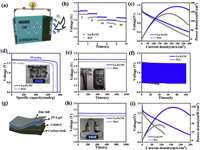 The La-Fe/NC catalyst was used to construct a rechargeable Zn-air Battery (ZAB) with an air cathode (Fig. 4a). A comparative study was conducted with a commercially available Pt/C-based ZAB under the same conditions using electrochemical tests. Constant current discharge measurements showed that the La-Fe/NC-based ZAB exhibites a stable voltage plateau of 2 h at 1.31, 1.27, 1.24, and 1.21 V for discharge current densities of 2, 5, 10 and 15 mA/cm2, respectively (Fig. 4b). These results indicate that the La-Fe/NC catalyst as an air cathode shows, the rapid reaction rate of ORR. The La-Fe/NC-based ZAB exhibited an excellent peak power density of 179.8 mW/cm2 (Fig. 4c), higher than the Pt/C-based ZAB with 140.5 mW/cm2. Furthermore, the La-Fe/NC-based ZAB displayed an outstanding specific capacity of 755 mAh/g at 10 mA/cm2 compared to the Pt/C-based ZAB with only 691 mAh/g (Fig. 4d). Moreover, the two ZABs combined as a power source were able to power an LED light bulb. The bimetallic catalyst may have more active centers compared to the commercial Pt/C, thereby improving the catalytic activity.