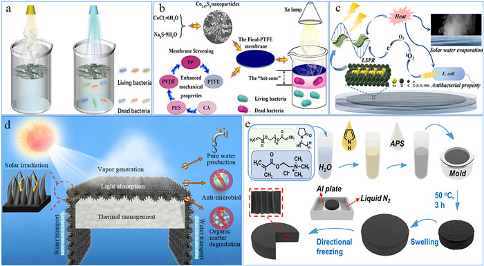Given that the photothermal material can produce high temperatures during operation, it can effectively eliminate bacteria due to the thermal effect. Therefore, the inherent thermal properties of the device can be harnessed for this purpose. Guan et al. incorporated 2D borophene nanosheets into cellulose nanofibers (CNF) paper, resulting in the fabrication of flexible borophene papers (Fig. 1a) [40]. Under 3 kW/m2 illumination, almost 100% of Gram-positive and Gram-negative bacteria were killed within 20 min. Zhao et al. prepared Co2.67S4 nanoparticles deposited polytetrafluoroethylene (PTFE) membrane, which has demonstrated significant antibacterial properties, effectively inhibiting bacterial growth, as depicted in Fig. 1b [41]. However, the antibacterial efficacy of these devices is solely reliant on the photothermal effect, making it highly susceptible to variations in light conditions. Consequently, its practical application yields suboptimal results.