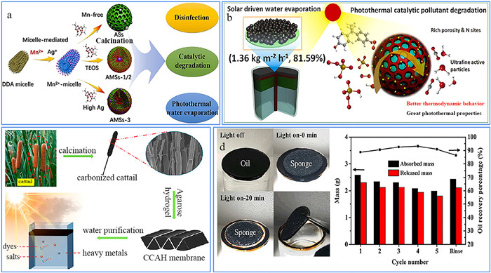 | Fig. 2. Pollutant treatment. (a) Schematic of multifunctional Micelle-mediated metal assembly strategy for the synthesis of the Ag@MnOx/m-SiO2 nanosphere. Copied with permission [50]. Copyright 2022, Elsevier. (b) The SiO2@Co/C photothermal nanosphere with optimal abundant active sites. Copied with permission [51]. Copyright 2023, Elsevier. (c) Schematic diagram of preparation process and application of carbonized cattail–agarose hydrogel (CCAH) composite membrane for solar water evaporation and water purification. Copied with permission [54]. Copyright 2021, American Chemical Society. (d) Schematic illustration of the fabrication process of PNIPAm/PPy@MS and absorption of mineral oil experiment. Copied with permission [59]. Copyright 2018, Wiley. | |