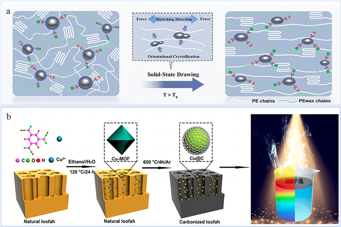 Huang et al. suggested a highly durable photothermal material by combining liquid metals (LMs) with polymers through dynamic crosslinking, leveraging the distinctive mechanical deformability of LMs [64]. During the stretching process, the polymer chains can undergo orientational crystallization, while the embedded core-shell structured LMs droplets are squeezed using the dynamically cross-linked interface, as shown in Fig. 3a. The resulting composite has a highly aligned structure, thus demonstrating exceptional mechanical properties. Its tensile strength measures 283.7 MPa, enabling it to support a weight 200,000 times its own. The LMs dispersed in the polymer skeleton makes the material flexible and long-term structural reliability, the material can bear 100,000 cycles. Ren et al. designed a highly efficient solar steam making device, Cu nanoparticles encapsulated in ultra-thin graphene were in-situ grown on carbonized loofah sponge by pyrolysis of metal-organic skeleton and natural loofah sponge biomass (Fig. 3b) [65]. The graphene sheets efficiently shield Cu from oxidation in normal surroundings, which is advantageous for achieving the plasmonic heating of Cu0 during solar vapor generation. Xie et al. designed and fabricated a micro/nanostructured polyethylene/carbon nanotubes foam with interconnected open-cell structure and graphite oxide/carbon nanotubes (GO@CNTs) coating (MN-PCG) using micro extrusion compression molding (μ-ECM) method [66]. Due to the strong bonding between the polyethylene framework and the F-GO@CNTs resulting from μ-ECM, the surface of the MN-PCG foam displays a uniform arrangement of primary micropillars, as shown in Fig. S10 (Supporting information).
